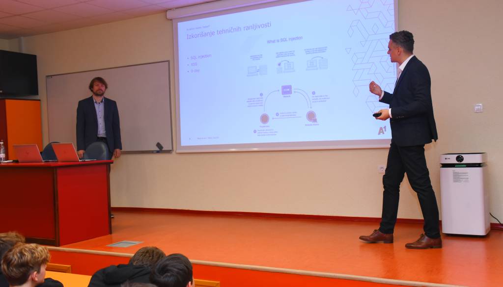 Predavanje sta izvedla Miloš Krunić in Mitja Osojnik iz varnostno-operativnega centra A1Ops, ki na A1 Slovenija skrbi za varnost poslovanja družbe in za kibernetsko varnost poslovnih partnerjev.
