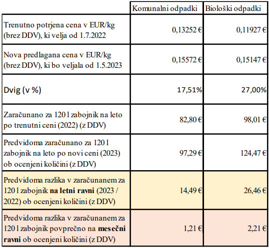 Občani bodo za 120-litrski zabojnik ob predvideni količini povprečno 62,5 kilogramov na mesec plačevali 2,21 evra več kot do sedaj, kar je 27-odstotna podražitev.
