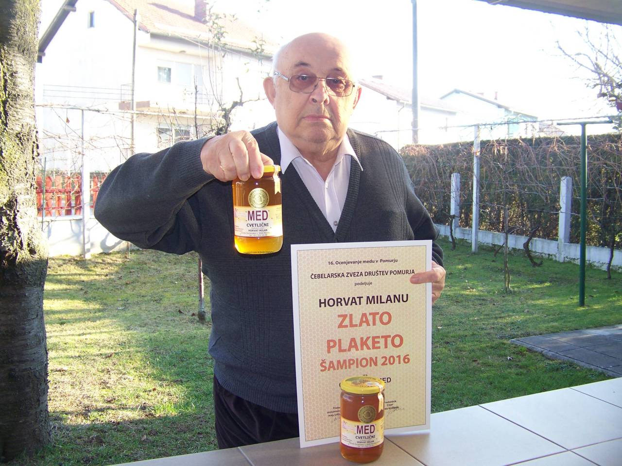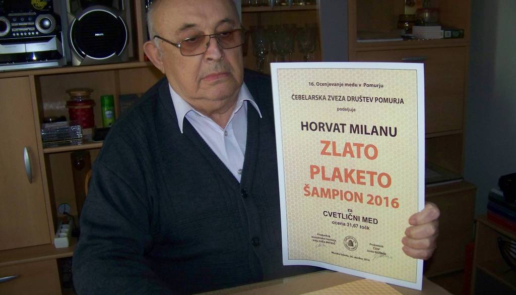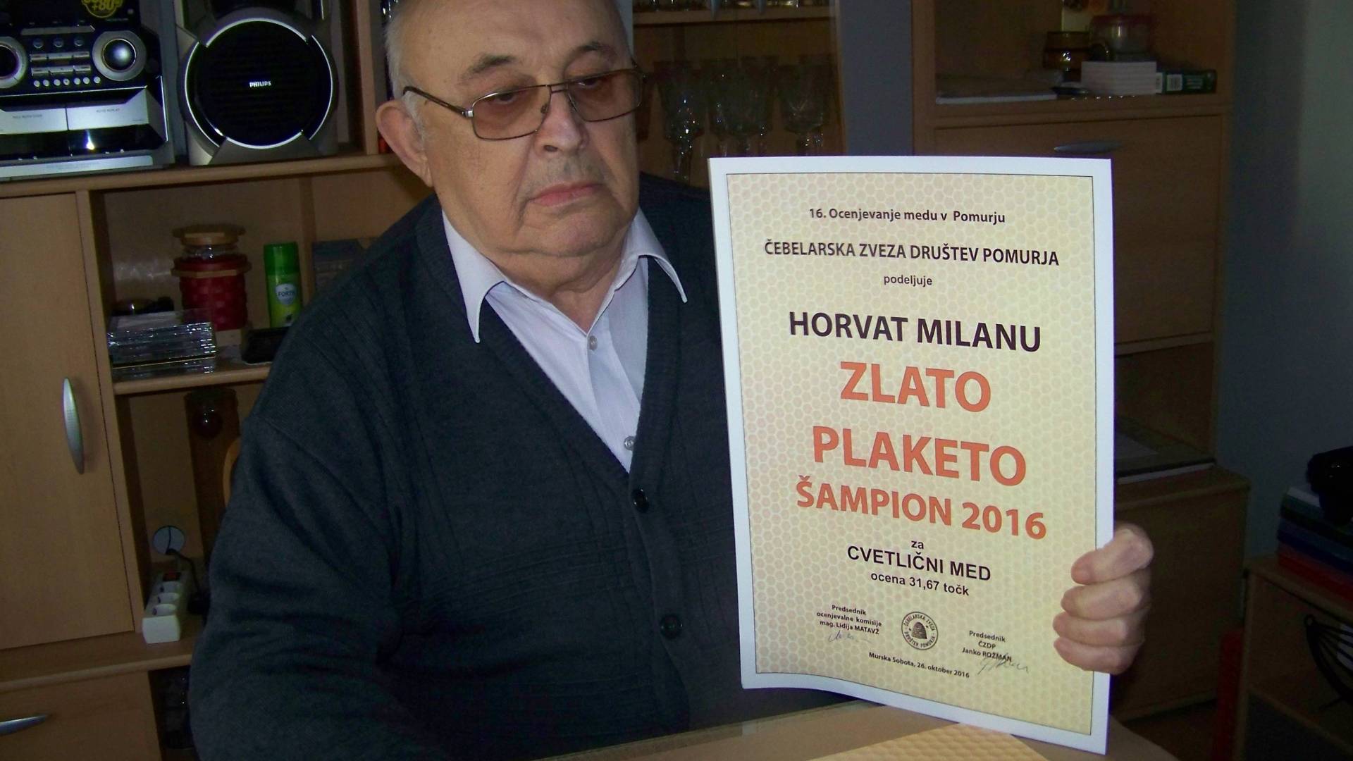 86-letni čebelar Milan Horvat iz Murske Sobote se s čebelarstvom ukvarja že 70 let. Dolgoletne izkušnje in izobraževanje na tem področju so se mu obrestovale, saj je na letošnjem 16. ocenjevanju medu v Pomurju osvojil zlato plaketo za cvetlični med z 31,76 točkami.