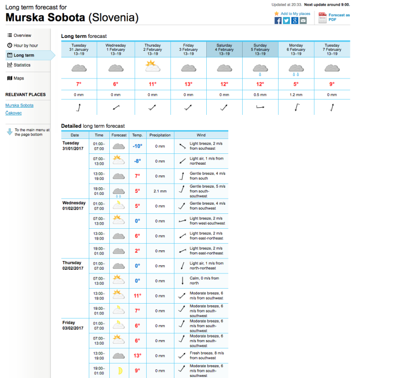 Po podatkih norveškega meteorološkega inštituta naj bi nas temperature pod lediščem pričakale le še v torek zjutraj, že popoldne pa se bodo temperature dvignile nad ledišče. V popoldanskih urah lahko pričakujemo tudi padavine v obliki dežja ali celo snega. Toplejše vreme se bo nadaljevalo čez ves teden, konec tedna pa lahko pričakujemo celo temperature do 13 stopinj Celzija. Ohladitev in letnemu času primerne temperature lahko zopet pričakujemo v drugem tednu februarja, ko naj bi se živo srebro zopet spustilo pod ničlo.