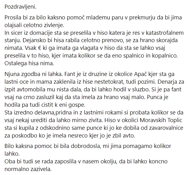 »Prosila bi za bilo kakšno pomoč mlademu paru v Prekmurju, da bi jima olajšali celotno življenje. Bilo kakšna pomoč bi bila dobrodošla, mi jima pomagamo, kolikor lahko.