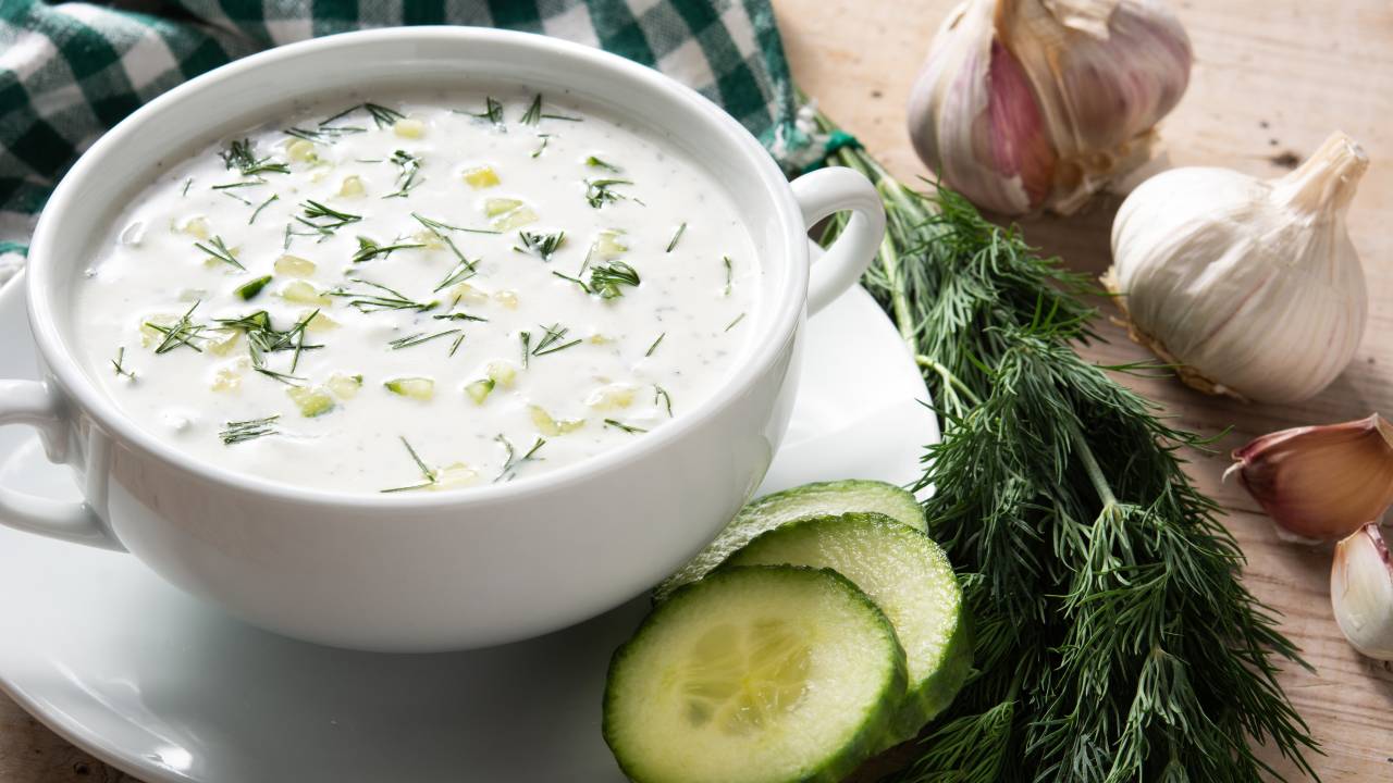 V skledi zmešajte kislo smetano ali jogurt. Dodajte strt ali drobno narezan česen ali čebulo ter sesekljan svež koper. Po okusu solite in poprajte ter dodajte mleto sladko papriko.