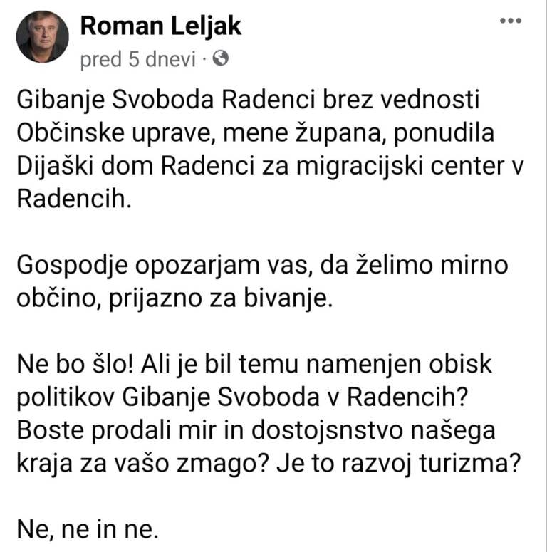 Marsikoga je zmotila tudi objava, ki jo je župan Leljak objavil v sredo pred volitvami. Na družbenem omrežju Facebook je opozoril, da je Gibanje Svoboda Radenci za migracijski center ponudila dijaški dom v občini, kar sta zanikali tako stranka kot vlada.