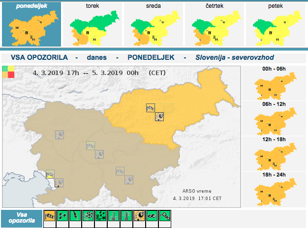 Agencija Republike Slovenije za okolje opozarja, da bo danes popoldne in zvečer predvsem na vzhodu in jugu Slovenije ter v višjih legah pihal močan jugozahodni veter. Najmočnejši sunki bodo po nižinah lahko presegli hitrost 70 km/h, v višjih legah pa tudi 90 km/h.