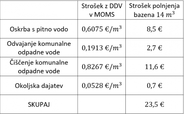 Strošek polnjena bazena iz domače pipe pa znaša bistveno manj, 23,5 evrov za bazen velikosti 14 kubičnih metrov.