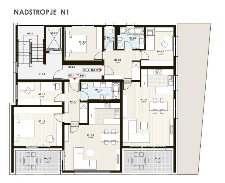 Blok ima posebej oblikovana pomična senčila, ki omogočajo regulacijo svetlobe po želji. Ogrevajo se z lastno toplotno črpalko zrak voda in s talnim gretjem.