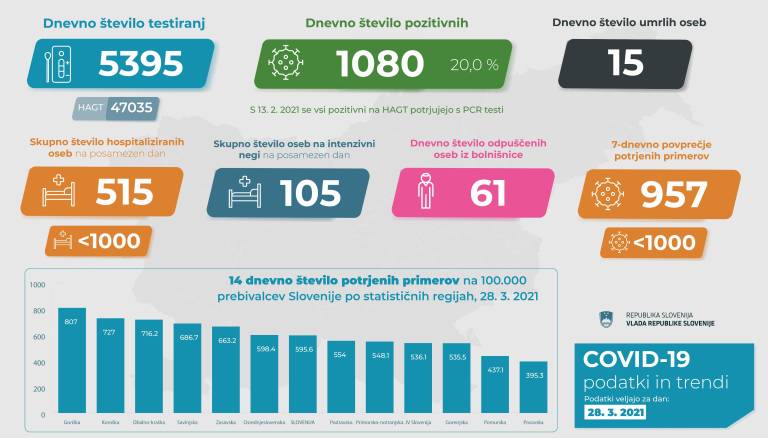 V Sloveniji so včeraj, 28. marca, opravili 5395 PCR testiranj na koronavirus in potrdili 1080 novih okužb, gre za 20-odstotni delež okužb.
