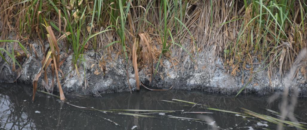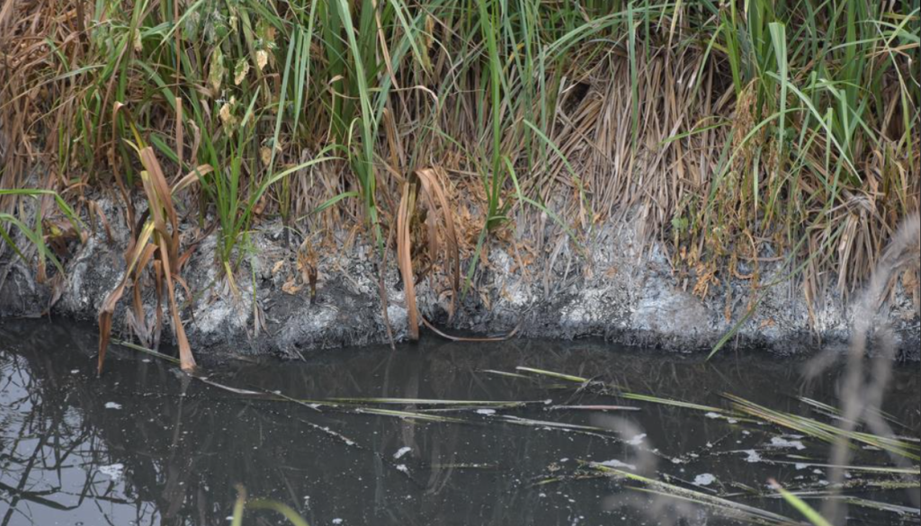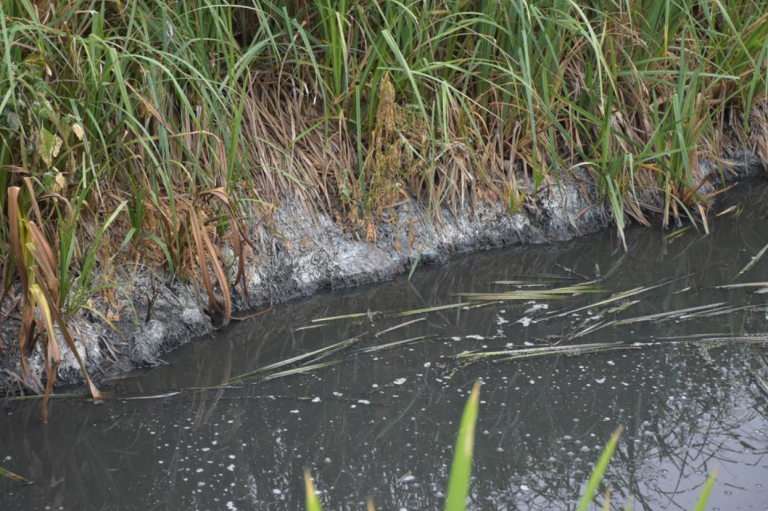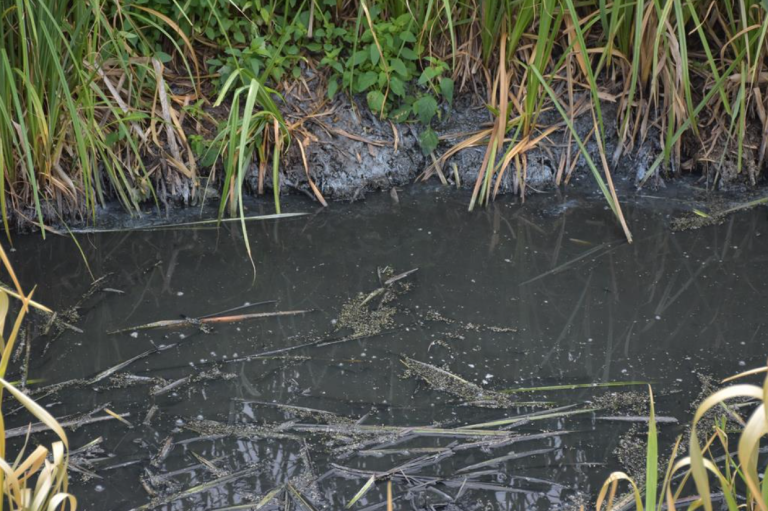 Smrdečo snov sta opazila v potoku Kopica za bioplinarno, sledi izlitja pa še na drugi strani ob bioplinarni na njivi pšenice, ki je bila posušena oziroma ožgana.