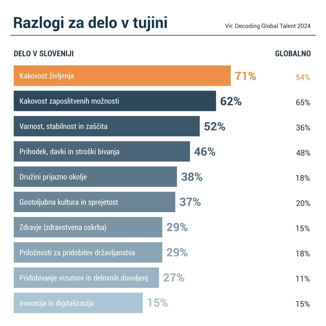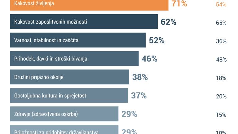 Kakovost življenja v Sloveniji je zmagovalni razlog za selitev k nam, na drugem mestu so priložnosti za delo, na tretjem pa varnost in stabilnost službe, medtem ko sta na primer manj pomembna pogoja pridobivanje licence za delo in inovacije in digitalizacija.