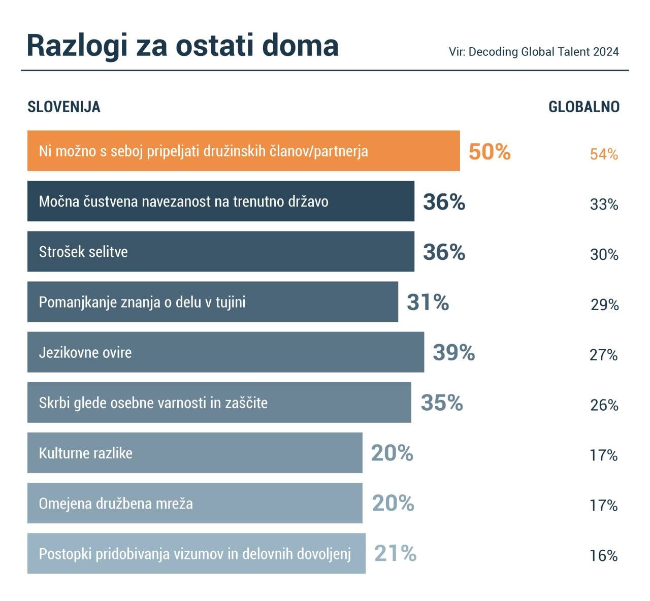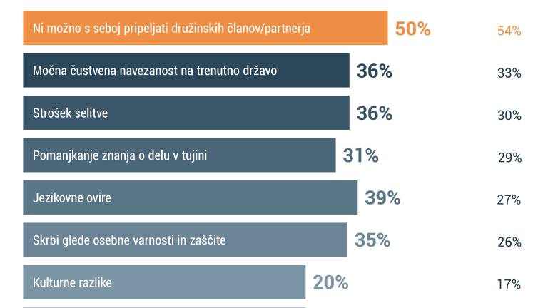 Med razlogi vprašanih Slovencev, kaj je tisto, kar odloča o tem, da raje delajo doma, je to nezmožnost, da bi v tujino pripeljali tudi družinske člane ali življenjskega partnerja, na drugem mestu je jezikovna bariera, tretje mesto pa si delita navezanost na domačo državo in stroški selitve.