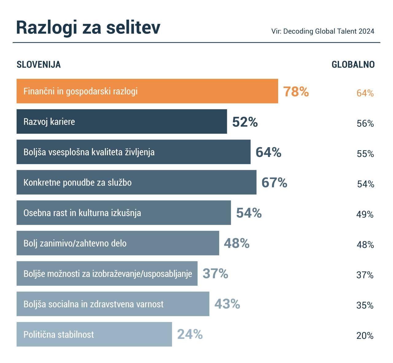 Med razlogi o selitvi zaradi službe v drugo državo vprašani Slovenci v visokem odstotku navajajo finančne in ekonomske razloge (78 odstotkov), na drugem mestu so konkretne ponudbe za delo (67 odstotkov), na tretjem pa splošno boljši pogoji dela (64 odstotkov).