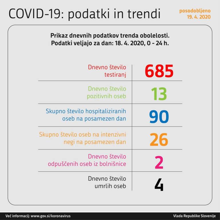 Včeraj je bilo opravljenih 685 testov, od tega jih je bilo 13 pozitivnih. Trenutno je hospitaliziranih 90 oseb, od tega jih je 26 na intenzivni negi.