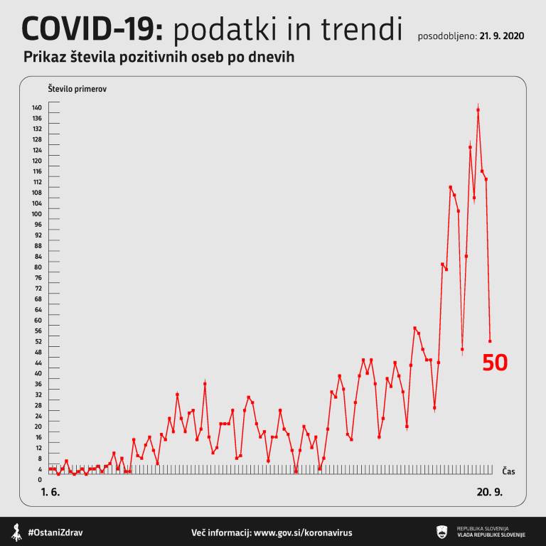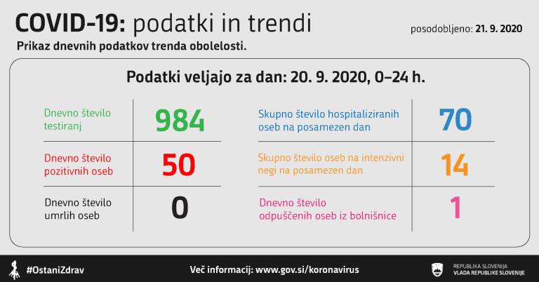 V Sloveniji so včeraj, 20. septembra 2020, opravili 984 testiranj na novi koronavirus. Potrdili so 50 novih okužb. Za primerjavo: dan prej so ob 2288 testiranjih potrdili 111 novih okužb.