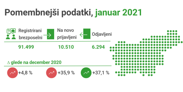 Brezposelnost je januarja zaradi upada zaposlovanja in večjega števila prijav brezposelnih sezonsko porasla. Tako je bilo januarja registriranih 91.499 brezposelnih, kar je 4,8 odstotke več kot decembra 2020 in 14,6 več več kot januarja lani.