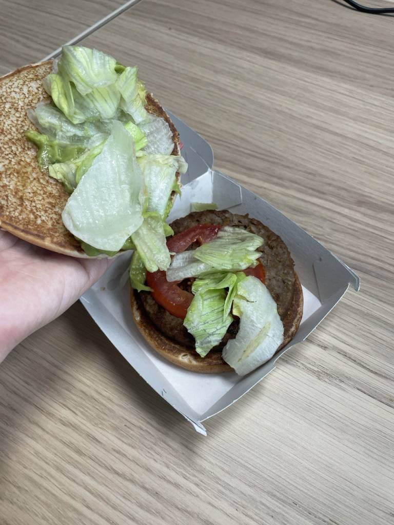 Prvi burger, ki smo ga naročili, je vegetarijanski in naj bi bil sestavljen iz sezamovega hlebčka, rastlinskega zrezka Beyond Meat, sira čedar, rezine paradižnika, zelene solate, dveh rezin kislih kumaric, sveže rdeče čebule ter izvirne majonezne omake, gorčice in kečapa.