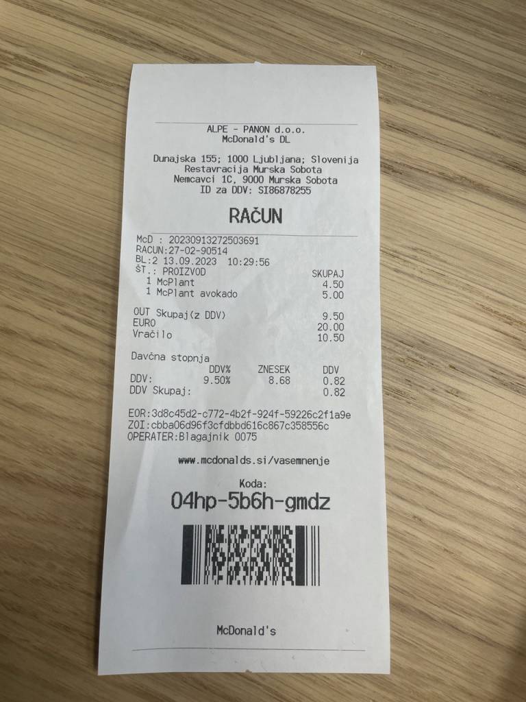 Odpravili smo se v Mcdonald's v Murski Soboti in naročili dva rastlinska burgerja - enega običajnega McPlant in enega z dodatkom omake iz avokada McPlant Avocado.