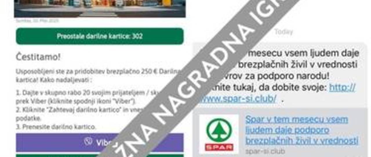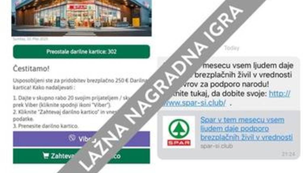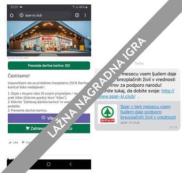 V SMS in Viber sporočilih se je v minulih dneh pojavila lažna nagradna igra, ki naslovljence neupravičeno nagovarja v imenu podjetja SPAR Slovenija in od njih zahteva delitev sporočila med prijatelje ter vpis osebnih podatkov za domnevno pridobitev Darilne kartice Spar (ali živil) v vrednosti 250 evrov. Gre za lažno nagradno igro in zlorabo blagovne znamke Spar Slovenija.