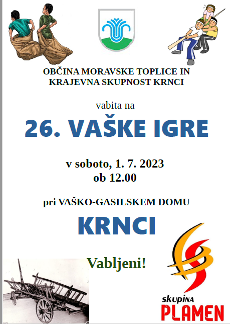 Občina Moravske Toplice in Krajevna skupnost Krnci vabita na 26. Vaške igre, ki bodo v soboto, 1. julija pri vaško-gasilskem domu Krnci.