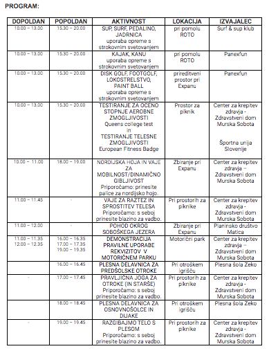 Na ta dan bo Zavod za kulturo, turizem in šport Murska Sobota s podporo Mestne občine Murska Sobota in v sodelovanju s Centrom za krepitev zdravja – Zdravstveni dom Murska Sobota, Športno unijo Slovenije ter različnimi klubi: Panexfun, Surf&Sup klub, PD Matica, Disc golf klub Murska Sobota, Kajak kanu klub Rotoattivo, Plesno šolo Zeko organiziral aktivnosti na in ob Soboškem jezeru ter na prireditvenem prostoru pri Expanu.