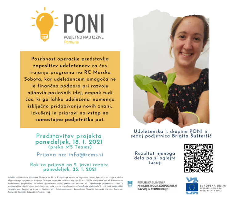Brigita Šušteršič, vrtnarka: Projekt PONI mi je zelo pomagal, saj smo udeleženci s pomočjo mentorjev našli, kateri je tisti problem, ki ga jaz rešujem na trgu. S pomočjo sem zaključila poslovni načrt, ki ti vzame veliko časa in se ga po navadi sam doma ne lotiš kar tako. Veliko pa mi je pomenila tudi podpora, različna predavanja na temo podjetništva, marketinga, računovodstva. Torej prejeli smo vse informacije, ki jih mladi podjetnik potrebuje za odprtje podjetja.