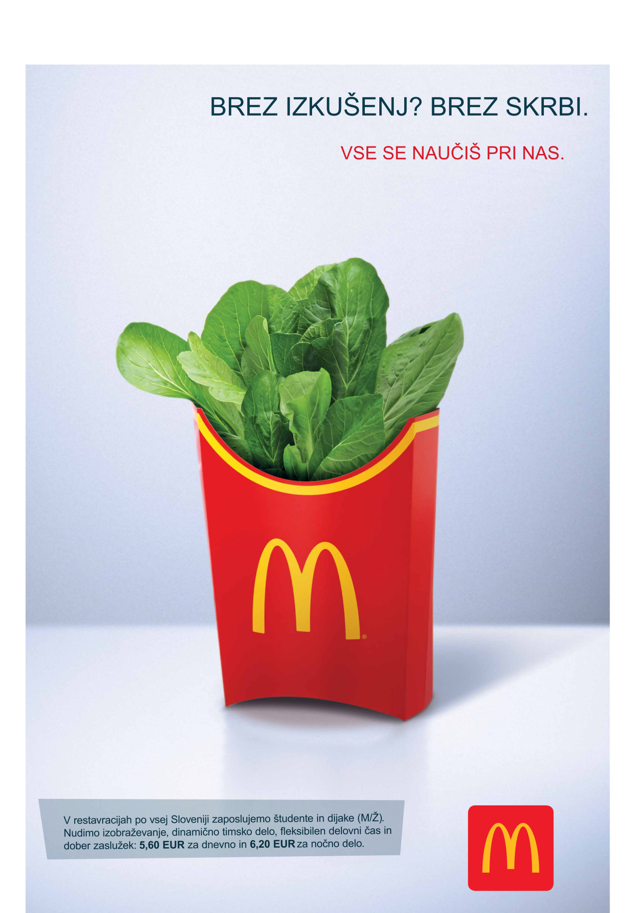 V soboškem McDonaldsu iščejo 15 fantov in 15 deklet za pomoč pri pripravi hrane, delo na blagajni, čiščenje, strežbo in druga dela. Delo bo potekalo 8 ur dnevno, izmenično in tudi v nočni izmeni.