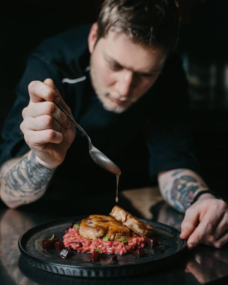 glavno jed - piščančja rolada s pistacijo, rižota z rdečo peso in naravna omaka z vinom