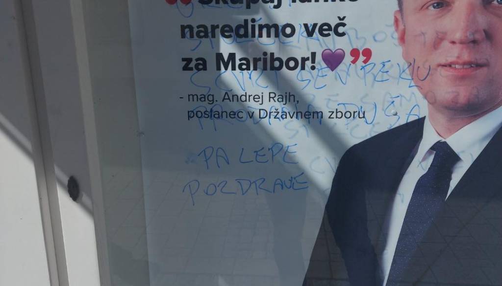 Popisan plakat mariborskega poslanca Andreja Rajha, čez logotip stranke pa zalepljen papir z zapisom: »Alenka, ne delaj nam škode.«