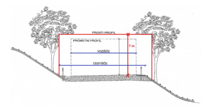 Drevesa ob cestah morajo biti obrezana tako, da je nad voziščem prosta višina najmanj 4,5 metra. Vegetacija mora biti obrezana tako, da ne ovira preglednosti, prometne signalizacije in javne razsvetljave.