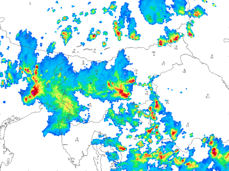 Popoldan bo spremenljivo oblačno s krajevnimi plohami in predvsem nevihtami. Ponekod na Goričkem so že nastale nevihte z nalivi in točo.