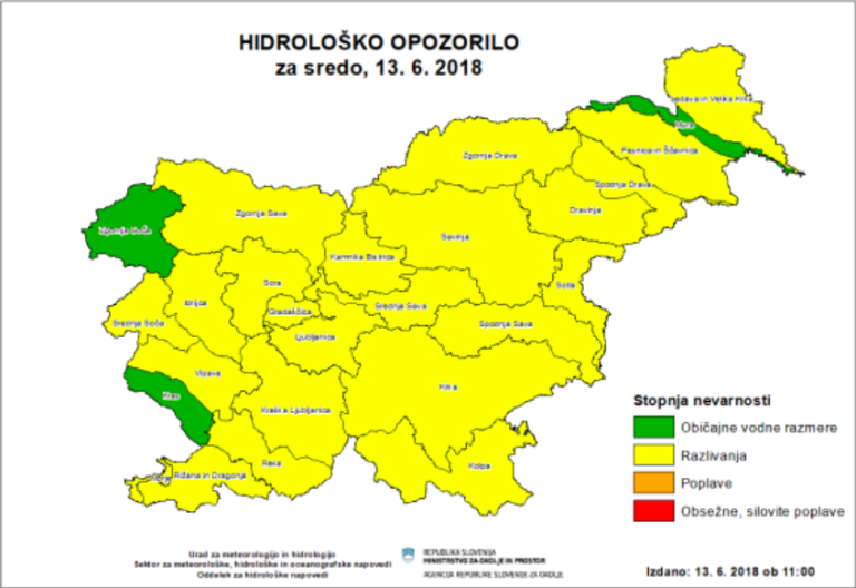 Vremenoslovci zato opozarjajo, da bodo danes popoldan, zvečer in v noči na četrtek ob močnejših nevihtah hitro narasli manjši vodotoki in hudourniki. Ponekod lahko pride do razlivanj. Pojav je možen v večjem delu države, zlasti pa v osrednji in vzhodni Sloveniji.