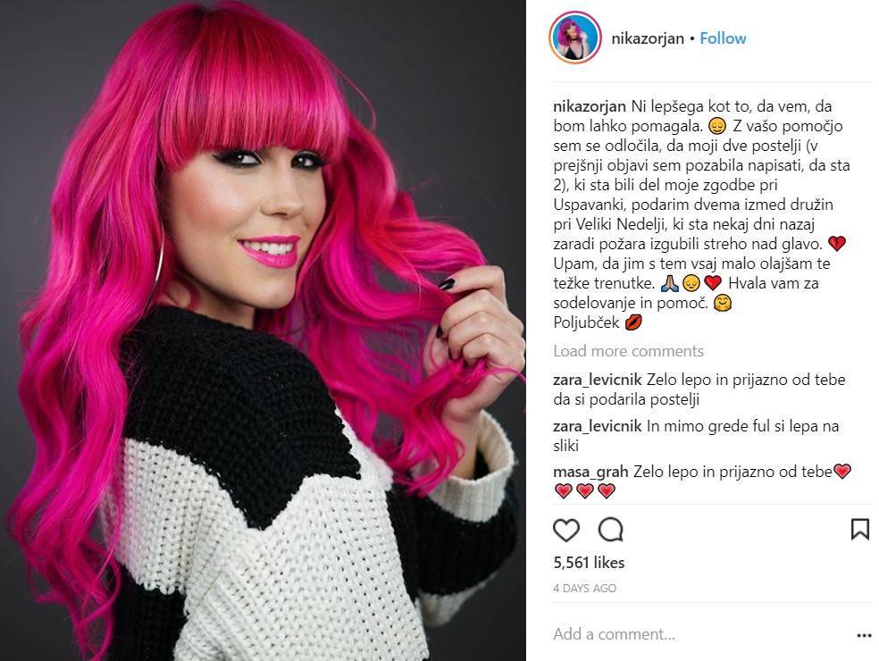 "Ni lepšega kot to, da vem, da bom lahko pomagala. Z vašo pomočjo sem se odločila, da moji dve postelji, ki sta bili del moje zgodbe pri Uspavanki, podarim dvema izmed družin pri Veliki Nedelji, ki sta nekaj dni nazaj zaradi požara izgubili streho nad glavo. Upam, da jim s tem vsaj malo olajšam te težke trenutke," je na svojem Instagram profilu zapisala simpatična pevka.