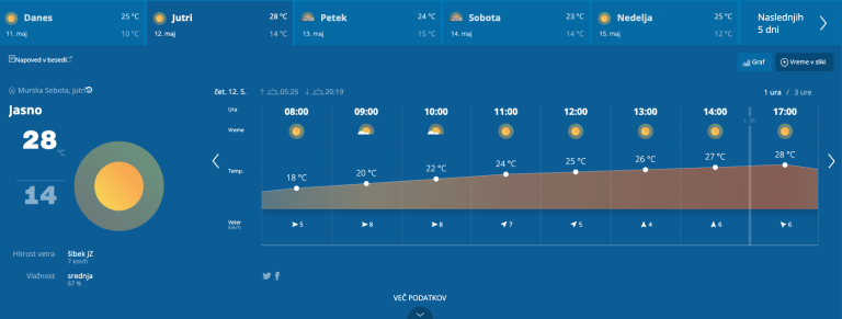 Pihal bo jugozahodni veter. Najnižje jutranje temperature bodo od 8 do 13, najvišje dnevne od 24 do 29 stopinj Celzija.