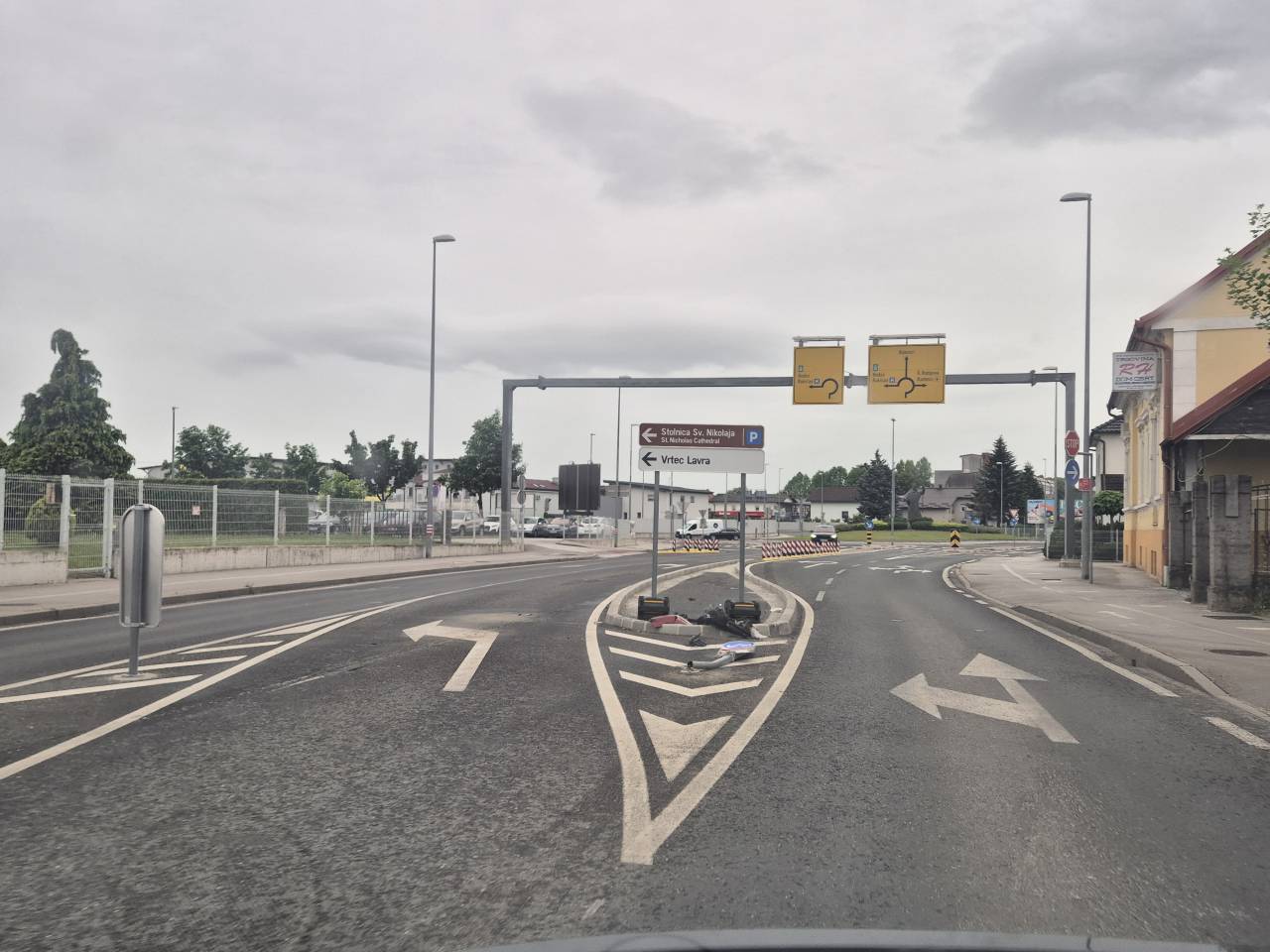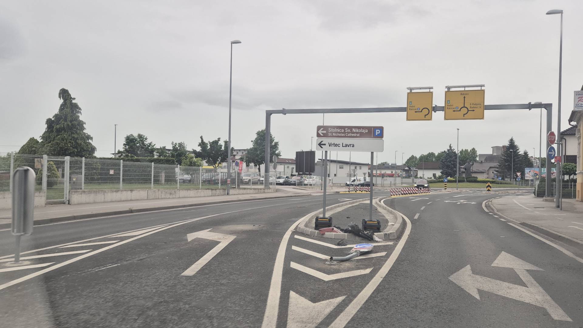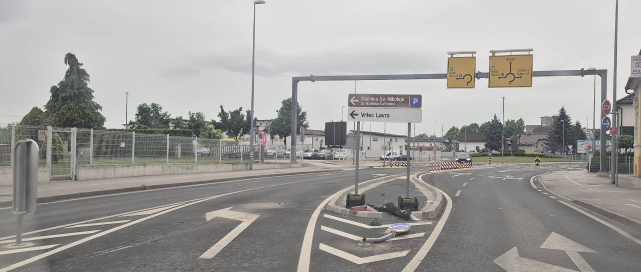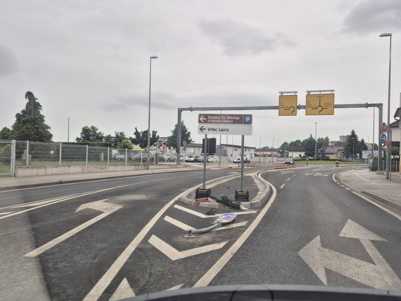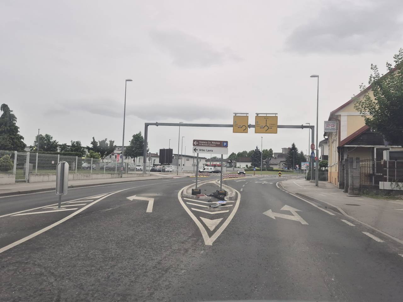 Prometni znak pred otokom je podrt, pred in na otoku pa so ostanki karoserije, ki kažejo na prometno trčenje.