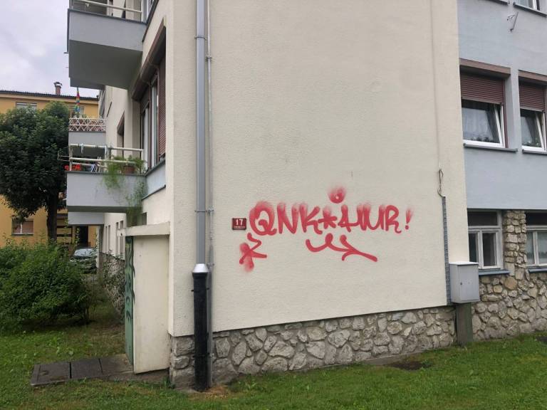 Kot je razbrati iz fotografij, so grafitarji za sabo pustili napise »tumor«, »hur«, »qnk« ...