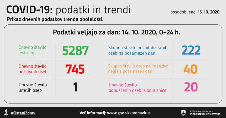 V Sloveniji so v sredo, 14. oktobra, opravili 5287 testiranj na koronavirus, kar je največ doslej. Potrdili so rekordnih 745 novih okužb. Skupno število vseh doslej potrjenih okužb s koronavirusom v Sloveniji zdaj znaša 10683.
