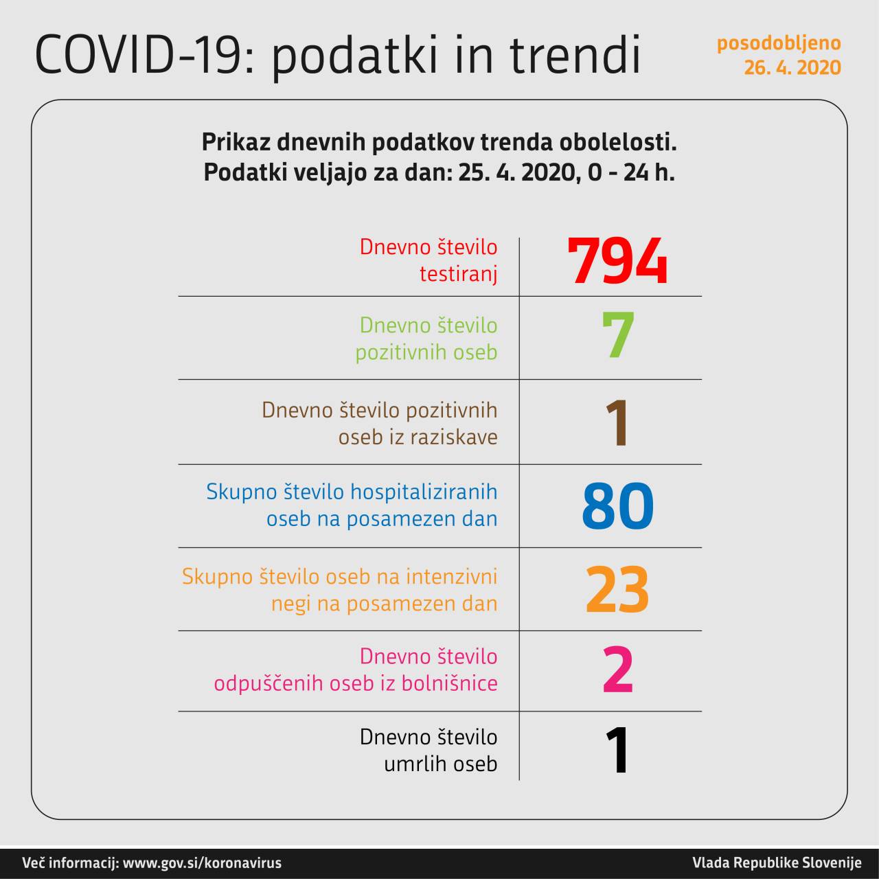 Žal pa tudi tokrat dan ni minil brez novih smrtnih žrtev, zaradi covid-19 je umrla ena oseba.