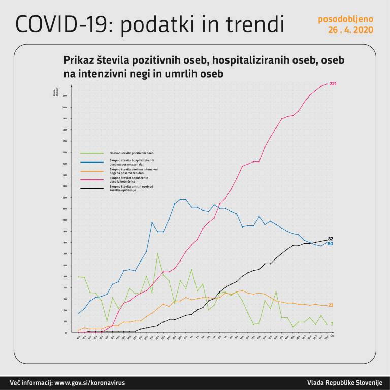 V bolnišnicah je trenutno zaradi koronavirusa 80 hospitaliziranih oseb, od tega jih je 23 na intenzivni negi. To pomeni, da se številka tistih, ki so na intenzivni negi, ni povečala. Iz bolnišnice sta bili odpuščeni dve osebi.