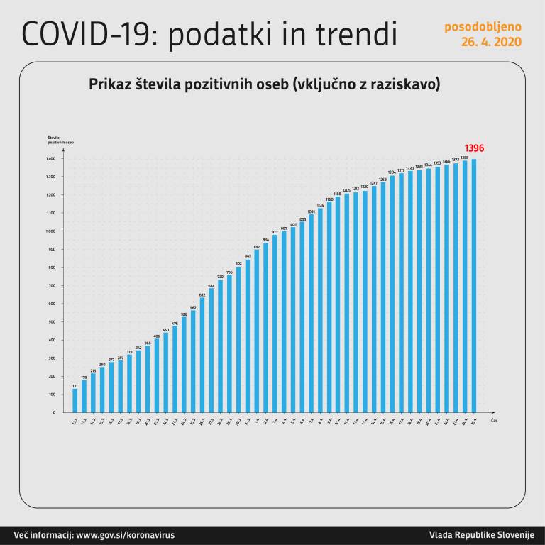 Znani so novi podatki o številu okuženih s koronavirusom v Sloveniji. Številka je od včeraj narasla za sedem, ena oseba je umrla, dve osebi so odpustili iz bolnišnice.