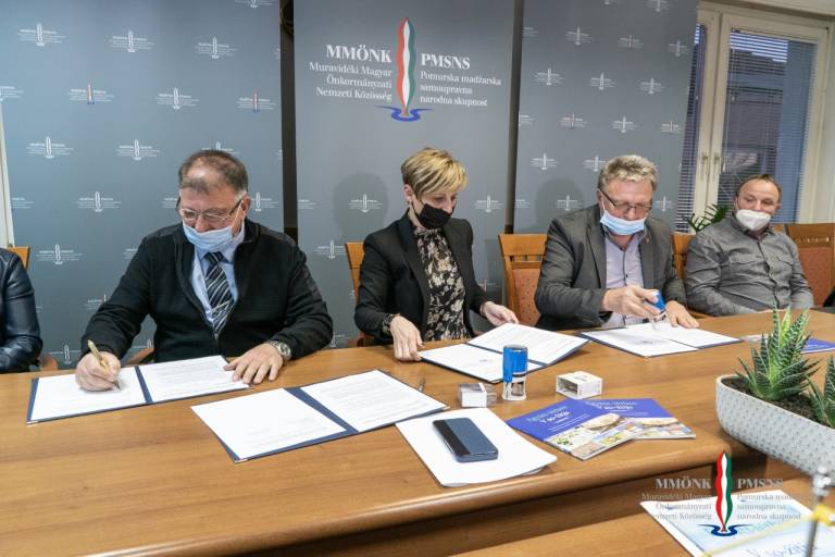 Na sedežu Pomurske madžarske samoupravne narodnostne skupnosti so podpredsednica sveta skupnosti Zsuzsanna Bači ter župana občine Hodoš in Dobrovnik Ludvik Orban in Marjan Kardinar podpisali sporazum, na podlagi katerega bosta omenjeni dvojezični občini upravljali s cestnima turističnimi vlakcema.