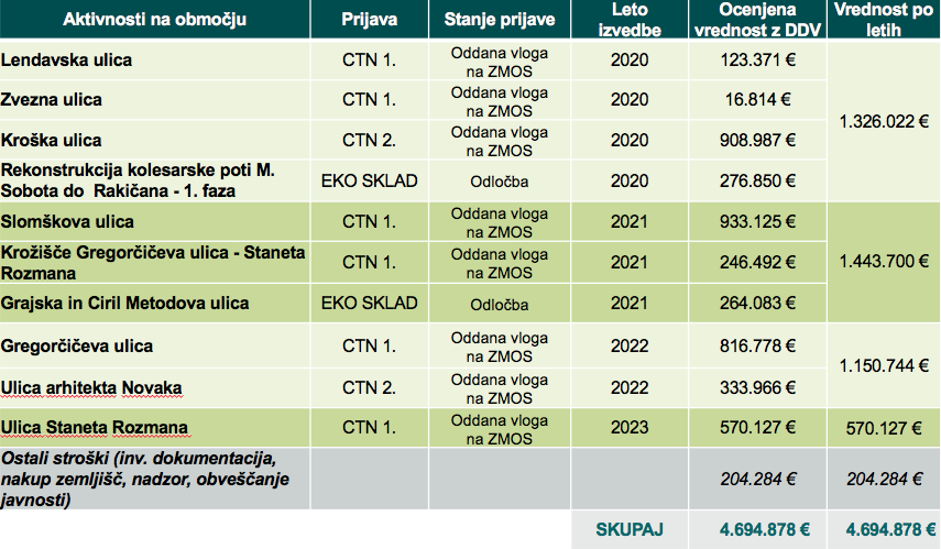 V naslednjih štirih letih bo tako prenovljenih devet odsekov. Kot je razvidno gradiva Mestne občine Murska Sobota želijo s projekti trajnostne mobilnosti povečati delež kolesarjev in pešcev, izboljšati kolesarske povezave, zmanjšati emisije, povečati telesno aktivnost prebivalcev ter občanom zmanjšati stroške vsakodnevne mobilnosti.