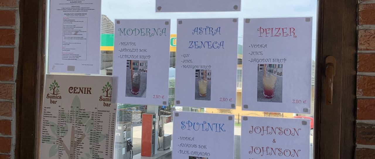 Tudi v gostinskem lokalu v Cerkvenjaku je akcijska ponudba, poimenovana po farmacevtskih podjetjih, kar pa večine ne prepriča, da bi se cepila s pravimi cepivi.