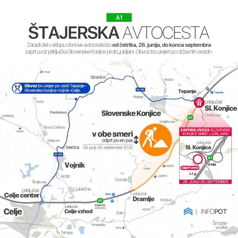 Zaradi popolne zapore smernega vozišča proti Ljubljani bo zaprt tudi uvoz priključka Slovenske Konjice v smeri Ljubljane. Obvoz bo urejen po regionalni cesti na relaciji Tepanje–Slovenske Konjice–Vojnik–Celje.
