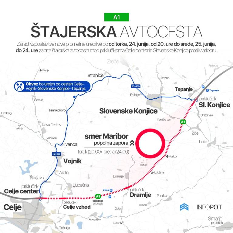 Obvoz bo v času popolne zapore urejen po državnih cestah na relaciji Celje–Vojnik–Slovenske Konjice–Tepanje.