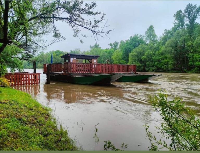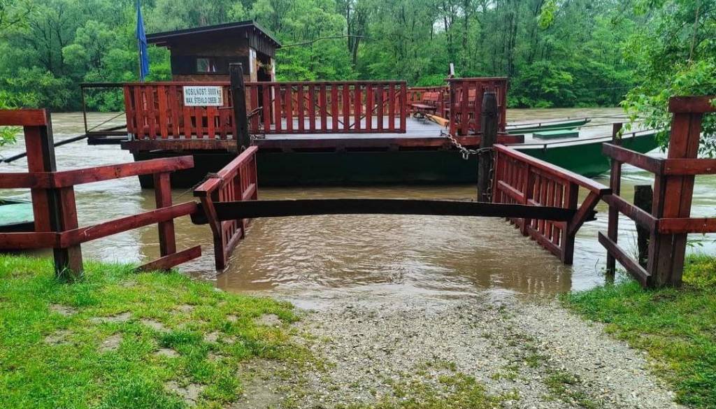 Mura že polni svojo strugo, fotografije razkrivajo, da je reka znatno narasla. Zaradi vremenskih nevšečnosti je privez Tinekovega broda na Gornji Bistrici že pod vodo.