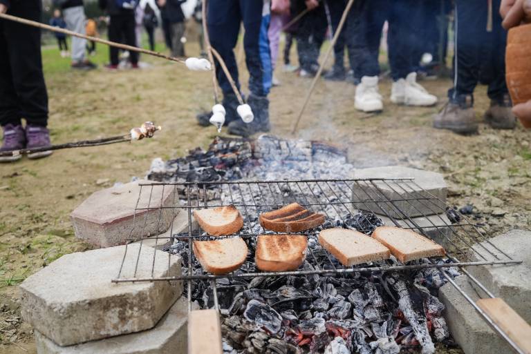 Poleg ogleda so si učenci pripravili malico na prostem – pajanje kruha ob ognjišču in pitje čaja iz domačih zelišč, sladkanega z lokalnim medom.