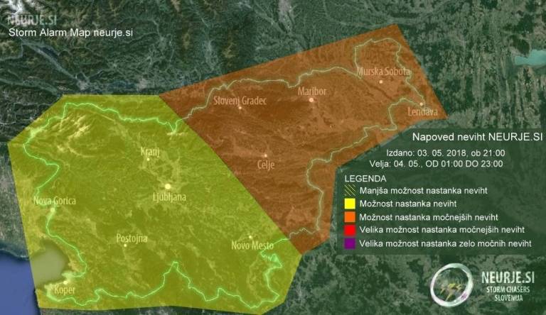 Na Koroškem, Štajerskem in v Prekmurju obstaja nevarnost nastanka močnih neviht z dolgotrajnejšimi nalivi in sunki vetra. Izključena ni tudi sodra ali toča.