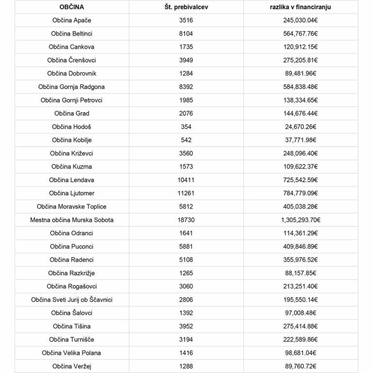 V Murski Soboti bodo po zavrnitvi predloga zvišanja povprečnine za 69,69 evra prikrajšani za 1.305.293 evrov, v Ljutomeru za 784.779 evrov, v Lendavi za 725.542 evrov in v Gornji Radgoni za 584.838 evrov. Najmanjšo razliko v financiranju bi občutila občina Hodoš, in sicer 24.670 evrov. Povprečnina se sicer izračuna na podlagi števila prebivalcev posamezne občine.