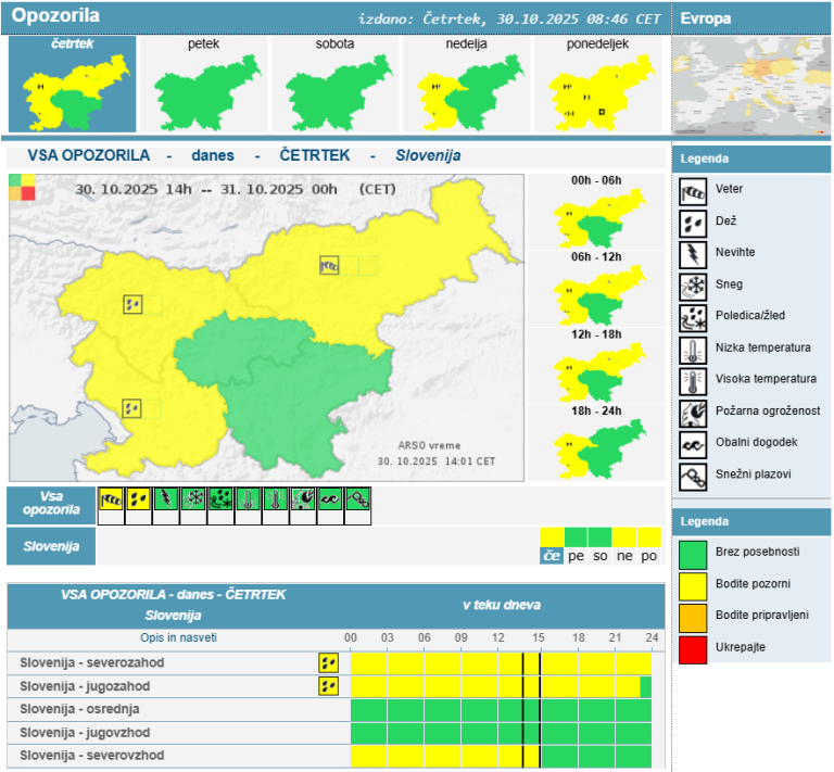 Popoldne bo nad Slovenijo prevladovalo oblačno vreme, le na skrajnem vzhodu se bodo oblaki občasno trgali. Na zahodu se bodo padavine še okrepile in se prehodno razširile proti osrednjim in vzhodnim delom države. Veter bo postopno slabel, temperature pa se bodo čez dan gibale med 15 in 20 stopinjami Celzija, na severozahodu okoli 13 stopinj Celzija.