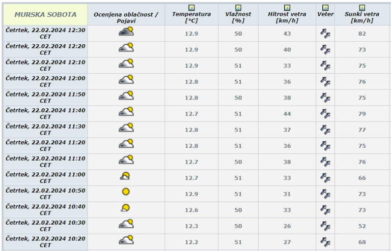 Vremenska postaja agencije za okolje v Murski Soboti je ob 12.30 v Murski Soboti izmerila sunek vetra s hitrostjo 82 kilometrov na uro.