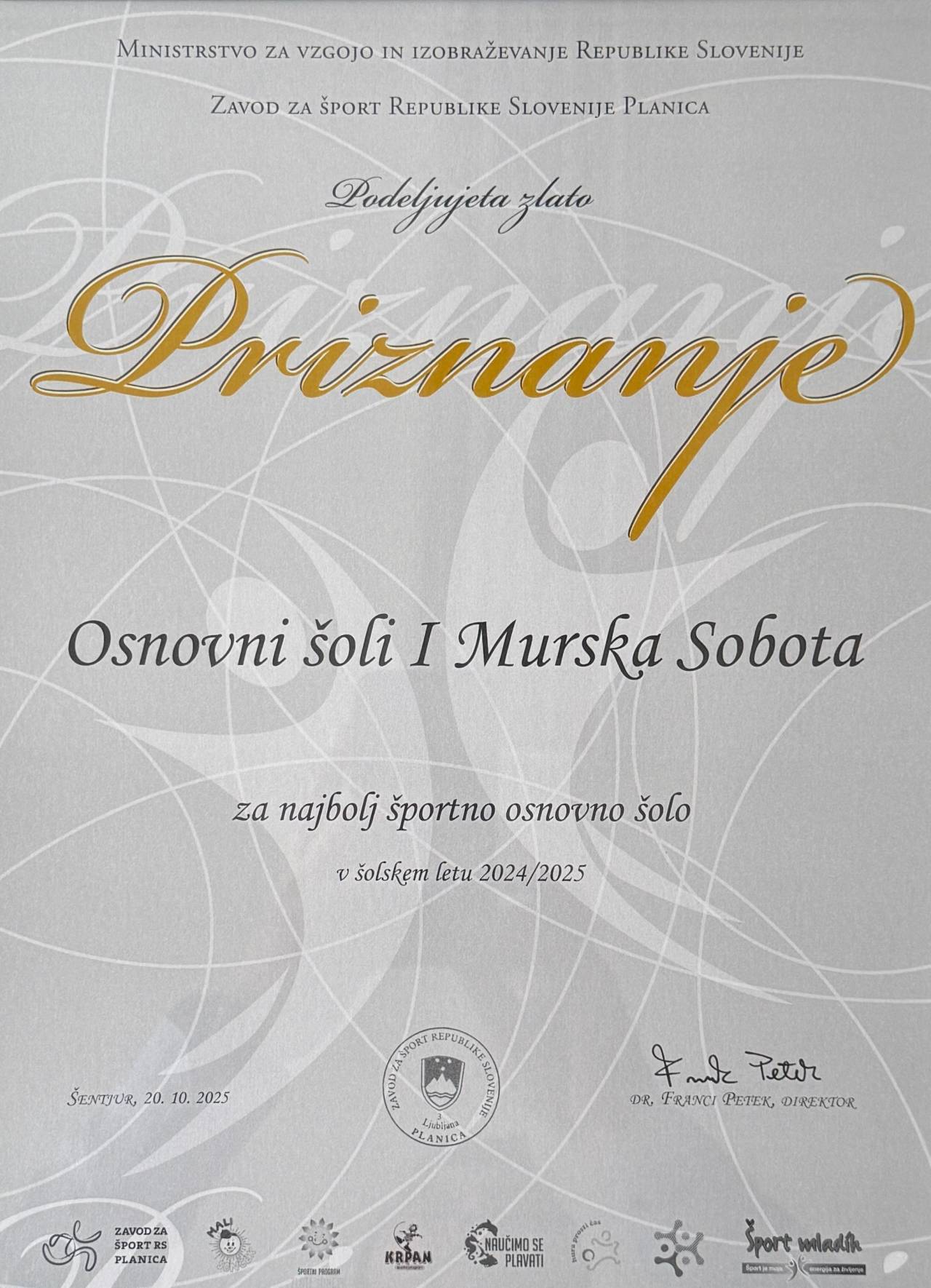Osnovna šola I Murska Sobota je osvojila zlato priznanje za najbolj športno osnovno šolo v šolskem letu 2024/25.
